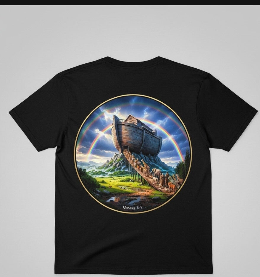 Witness the iconic moment of faith and deliverance with this striking Noah's Ark T-shirt. The vibrant, detailed graphic on the back captures the majesty of the Ark resting on the mountains after the Great Flood, framed by the divine promise of the rainbow. Below the Ark, a path of animals symbolizes the beginning of a new creation, while the reference Genesis 7:2 grounds the design in the biblical narrative.
