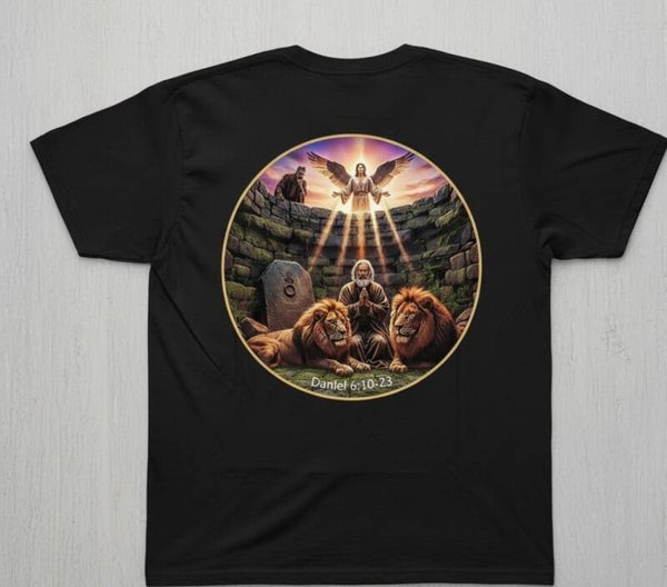 This powerful black, premium cotton T-shirt features an intense and detailed full-color circular graphic on the back, capturing the moment of Daniel’s miraculous deliverance from the lion's den. It's a bold and inspiring piece that celebrates courage under pressure and the power of prayer.