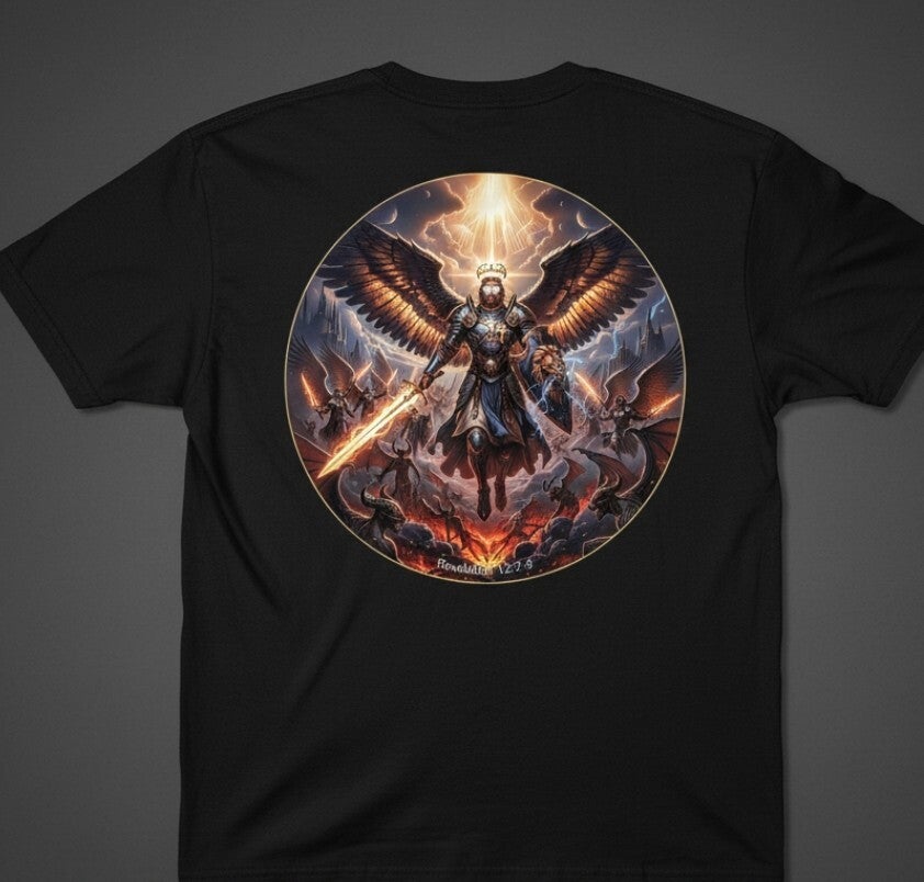 Iconic Symbolism: A bold statement of faith, protection, and the triumph of good over evil. The bottom features the subtle scripture reference: Revelation 12:7-9.