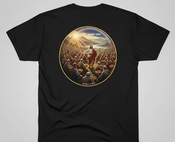 This striking t-shirt features a vibrant, circular illustration of the Feeding of the Five Thousand, one of the most beloved miracles in the Gospels. At the center, Jesus stands with open arms, surrounded by a multitude who are being fed, set against a stunning backdrop of mountains, a lake, and a radiant rainbow—a sign of God's promise.