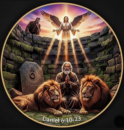- βThe Scripture: The reference Daniel 6:10-23 is prominently displayed, grounding the powerful imagery in the historical narrative..
